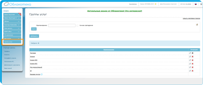 Группа услуг – это логическое объединение ресурсов. Применяется для логической группировки ресурсов, услуг, с возможностью выставления счетов по каждой группе в отдельности.