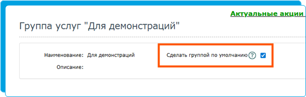 Изменить параметр по умолчанию можно внутри самой группы, поставив галочку в блоке "Сделать группой по умолчанию", а также задать такое условие при создании ресурса или новой группы услуг.