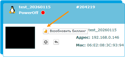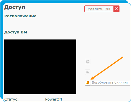 Для запуска виртуальной машины и возобновления списаний за ее использование нужно воспользоваться кнопкой «возобновить биллинг».