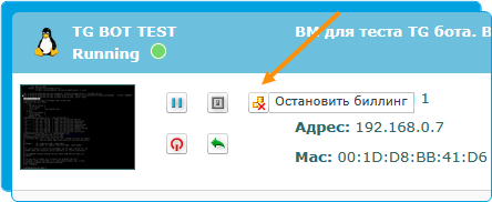 Отключение биллинга – останавливает ВМ с запретом изменений параметров ВМ, запуска восстановления из снапшота, бэкапа, а также закрывает доступ к подключению через консоль.