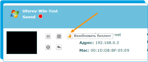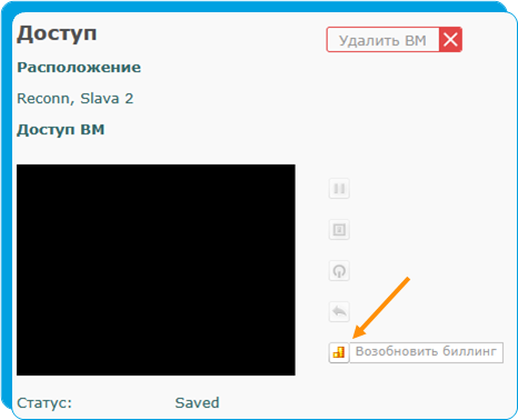 Для запуска виртуальной машины и возобновления списаний за ее использование нужно воспользоваться кнопкой «возобновить биллинг».