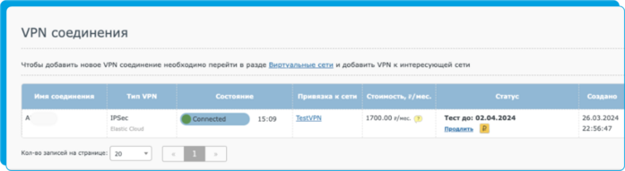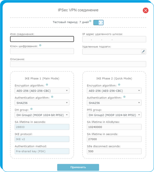 Сервис позволяет создать Site-to-Site туннель в соответствии со стеком протоколов IPsec