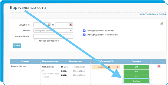 2. Возле нужной виртуальной сетью нажмите кнопку Routing.