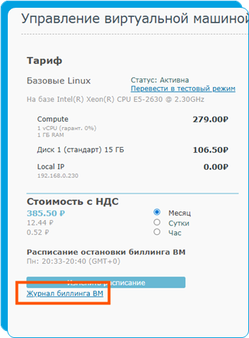 Под кнопкой "Изменить расписание", находится ссылка "Журнал биллинга ВМ".