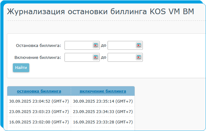Можно отфильтровать период и посмотреть точное время остановки и включения списания средств.